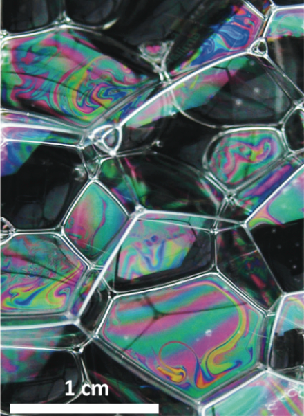 En utilisant une mousse « simplifiée » – un seul des multiples films minces séparant les bulles dans la mousse – et en observant le comportement du film juste avant son éclatement, alors d’une épaisseur de quelques dizaines de nanomètres, ils ont constaté un phénomène inattendu pour ce polymère : en dessous d’une certaine finesse, les films ne s’amincissent plus continûment mais par couches successives. Toutes les couches sont d’épaisseur identique, ce qui est la signature d’une taille caractéristique au sein du liquide. En étudiant ce liquide polymérique par diffraction des rayons X au Synchrotron « Soleil », ils ont relevé la présence d’une longueur caractéristique identique à la hauteur des couches mesurées précédemment, et directement corrélée à la taille des molécules. Les chercheurs pensent que cette observation est la preuve que l’auto-organisation des polymères à proximité de l’interface entre le liquide et l’air est responsable de la dynamique très lente d’amincissement de ces films.